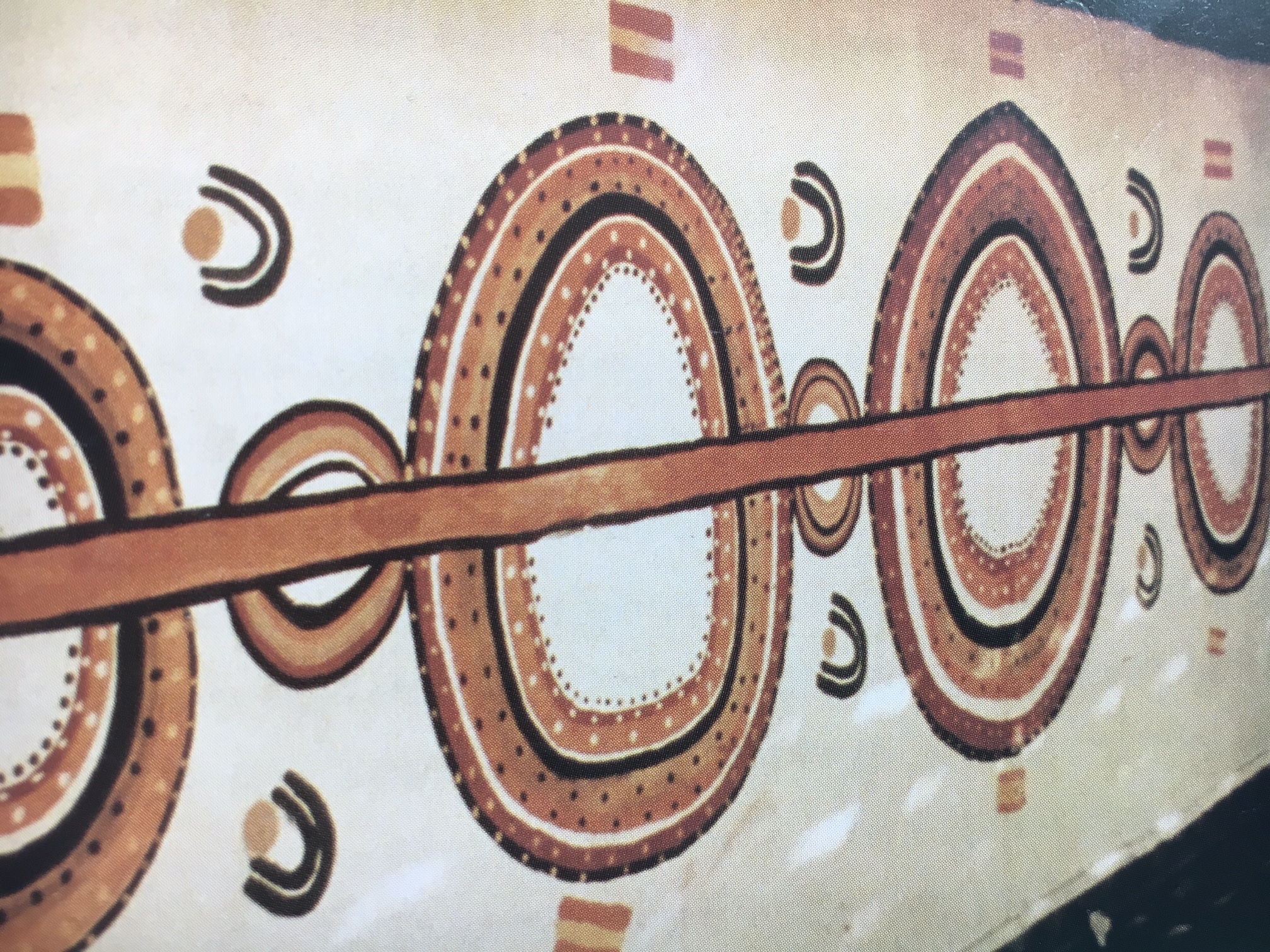 The design is developed from those used on various surfaces during ritual. It is similar to the signs painted on kutitji (softwood shield), presented to novices at ceremony. The design also closely resembles icons that adorn the walls of a rock shelter in distant Kaytej country, demonstrating the reach of desert iconography.