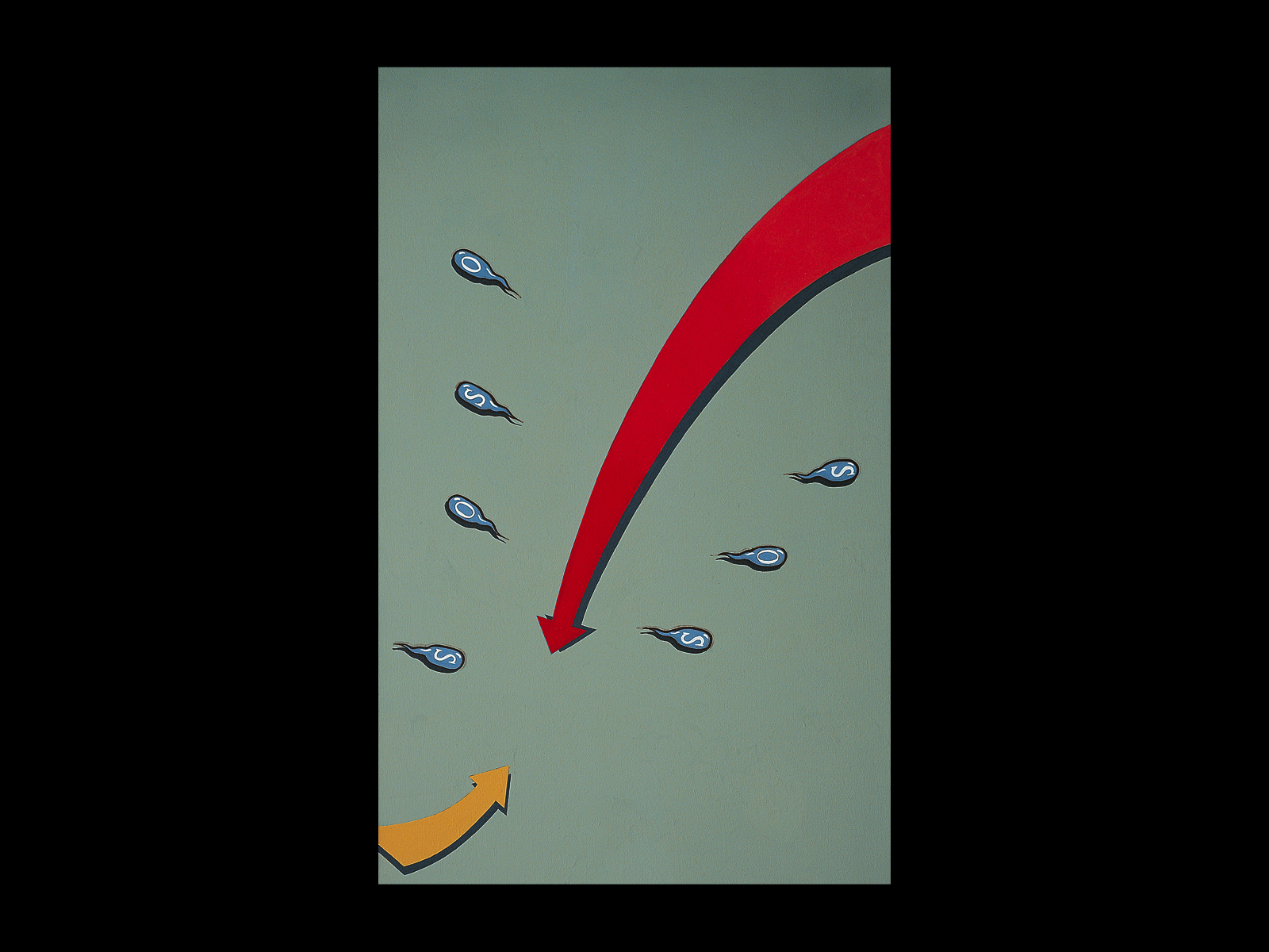 It is also in Guan Wei’s cartographic canvases that Aboriginal figures enter his oeuvre as black silhouettes, running, dancing and hunting. In Trepidation Continent (2003; fig. 8)—one of many works with militaristic overtones that critics have associated with Howard’s draconian immigration policies—two men brandish spears and small shields at the centre of a map of Australia. They are shown chasing a pair of kangaroos, oblivious to the battalions of soldiers, disembodied sentinels, warships bristling with guns, helicopters, and boats overflowing with human cargo that surround them. Similar figures appear in Target (2004; fig. 9), engaged in bitter conflict with invading soldiers, helicopters, tanks and fighter jets on a landmass boldly emblazoned with doom-laden place names. This painting introduces another aspect of Guan Wei’s Australerie: the shock of encounter, staged here as an eruption of colonising forces into a continent of Edenic bliss.