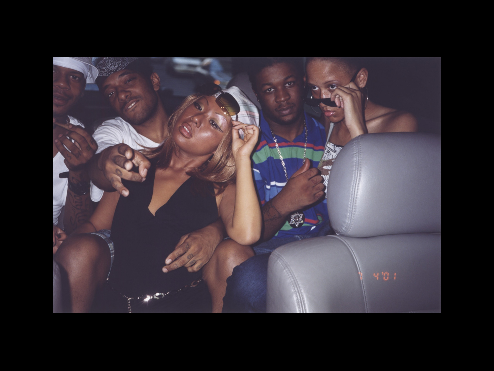 In the most widely discussed photograph of Lee in this series, she sits alongside four young African Americans on the back of a car (fig. 5). Lee has transformed herself into a “black” girl by tanning her skin darker and adopting the attitudes of a rapper’s entourage. She is seated between the legs of Prodigy—a member of the hardcore hip-hop group Mobb Deep. Lee is in a low-cut black dress adorned with a gold chain belt, which calls to mind the “bling” excesses of jewellery and accessories that typically characterise the materialistic absurdity of hip-hop culture in its more recent guises. Prodigy slightly raises his eyebrows, staring scornfully at the camera while making a hip-hop gesture of address. This photograph foregrounds a sustaining tension of contemporary hip-hop between the attempts to maintain its authentic, confrontational street credibility closely connected with the imagery of black masculinity, and its unprecedented openness and tolerance to diversities and differences under the capitalistic impulse of mass consumption. Lee’s involvement with the community, to some extent, illustrates a mode of group membership extricated from any culturally specific racial identity. Instead, it is largely formulated by the purchase, display and manipulation of certain fashion and commodity codes, as well as imitative performance of hip-hop gestures and demeanour.