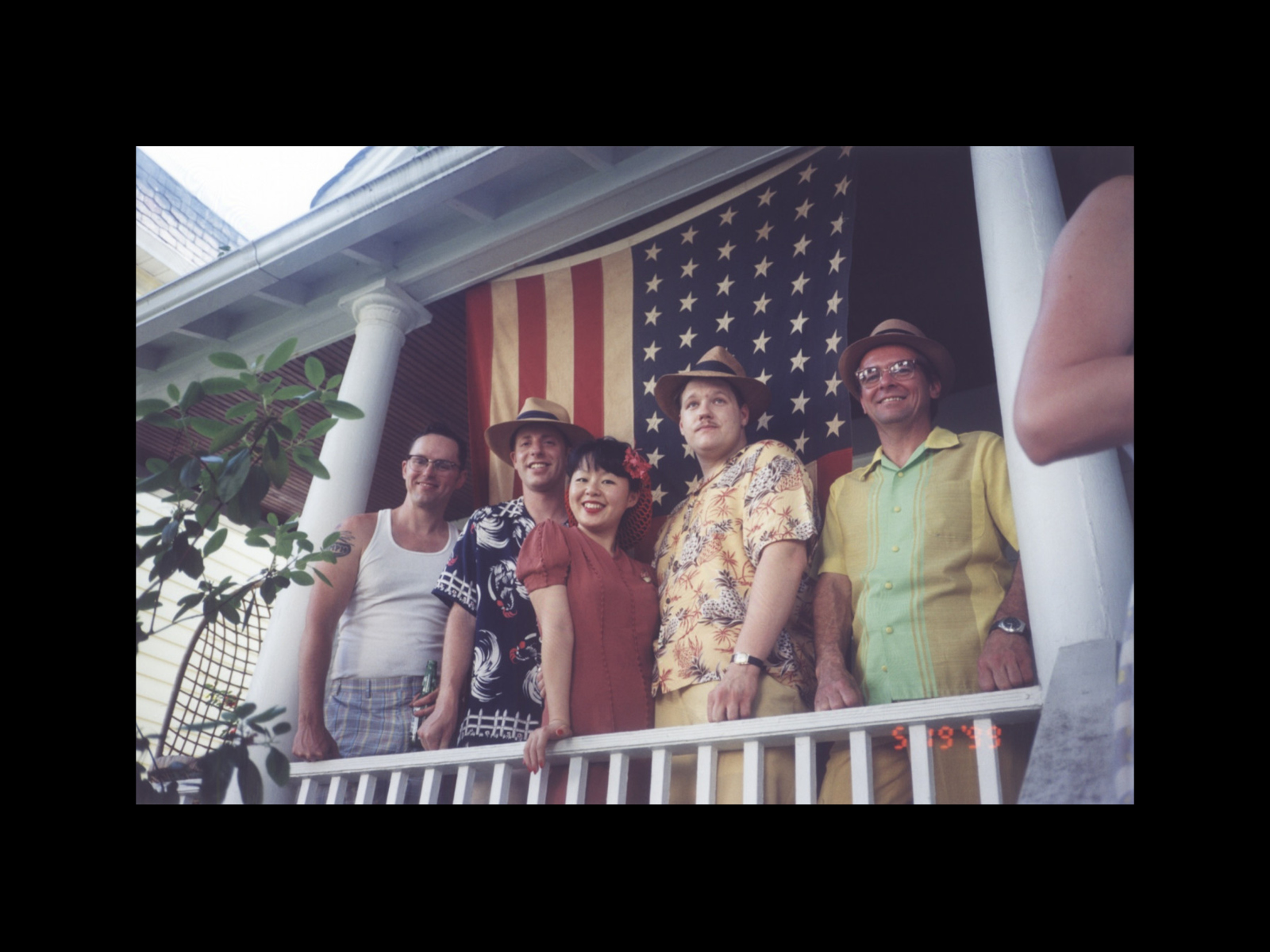 In another photograph, Lee is standing in the middle of four white men on the porch of a white wooden house (fig. 4). Behind them, an oversized American flag hangs from the interior ceiling. Lee wears a vintage red dress and pins up her hair with a red snood. A red flower is positioned behind her left ear, paired with the colour of her outfit and lipstick. Three men standing beside Lee wear Panama straw hats and short-sleeve tropical-print shirts. The fourth is in a white vest and plaid shorts. The title indicates that the photograph belongs to The Swingers Project, although it was not taken in a ballroom setting. Lee’s easily recognised East Asian face reveals her “outsideness” in this predominantly white community. As swing dancing is usually considered a typical heterosexual social activity between lovers and couples, Lee might be perceived as the partner of one of the men standing around her, with whom she gets involved in this patriotic scene in front of Old Glory as part of her process of “Americanization.” The clothing style and postures of all figures in the photograph demonstrate fairly entrenched heterosexual gender norms. As Berlant has also suggested, despite the panic and anxiety about immigration, women are often featured as good immigrants who are more likely to become real citizens and achieve ultimate cultural immersion through consensual marriage (with white men) and giving birth to the next generation.35 This brings to the fore another aspect of the privatisation of American citizenship in crisis, which prioritises the values of heterosexual reproductive families in the constitution of a “post-racial” but still “white-enough” American future through interethnic marriage and crossbreeding.